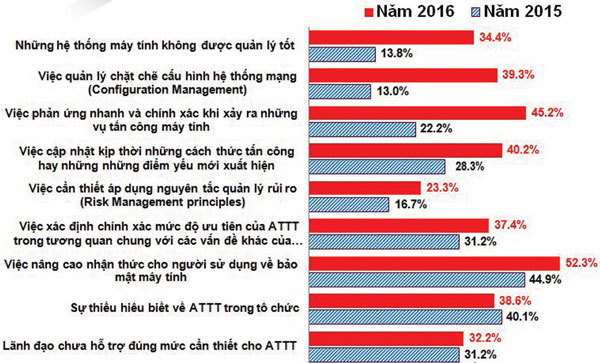 Các TC/DN đánh giá về vấn đề khó khăn nhất trong việc bảo đảm ATTT cho hệ thống thông tin như sau: Hệ thống máy tính không được quản lý tốt 34,4%; Quản lý chặt chẽ cấu hình hệ thống mạng 39,3%; Phản ứng nhanh và chính xác khi xảy ra nhữngvụ tấn công máy tính 45,2%; Cập nhật kịp thời những cách thức tấn công hay những những điểm yếu mới xuất hiện 40,2%; Cần thiết áp dụng nguyên tắc quản lý rủi ro (Risk Management principles) 23,3%; Xác định chính xác mức độ ưu tiên của ATTT trong tương quan chung với các vấn đề khác 37,4%; Nâng cao nhận thức cho người sử dụng về bảo mật máy tính 52,3%; Sự thiếu hiểu biết về ATTT trong tổ chức 38,6%; lãnh đạo chưa hỗ trợ đúng mức cần thiết cho ATTT được đánh giá là 32,2%.