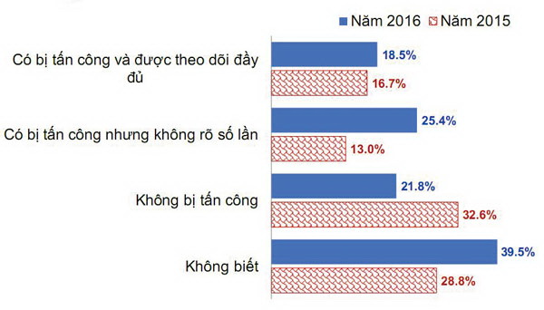 Về khả năng nhận biết bị tấn công mạng trong năm 2016, các chỉ số thống kê cũng cho thấy có sự tiến bộ rõ rệt. Khả năng các TC/DN nhận biết đơn vị mình: Có bị tấn công và theo dõi đầy đủ là 18,5%; Có bị tấn công nhưng không rõ số lần là 25,4%; Không bị tấn công 21,8%; Không biết bị tấn công là 39,5% (tỉ lệ năm 2015 lần lượt là 16,7%, 13%, 32,6% và 28,8%).